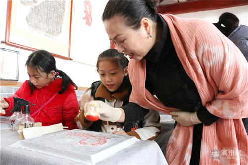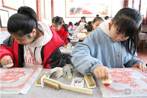 12月23日,在位于无棣县古城景区的鲁北非遗体验基地,该县第一实验小学的同学们正在金石传拓非遗传承人孙艳女士的指导下进行拓片制作。