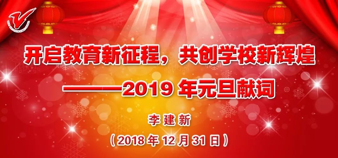 大河奔流开新路,层峦竦峙争高峰。每一滴汗水,都彰显着奔腾的力量;每一个梦想,都融汇于创造的时代。新时代新作为,新时代赋予教育事业新的使命!老师们,同学们,2019年的钟声即将敲响。即将到来的 2019年,必将是我校充满激情和希望的一年,实现新的突破、新的发展的一年。我衷心希望全体师生向着更加壮阔的航程,沐浴着改革开放的春风,担当实干,砥砺前行,以更优秀的过程创造最优秀的结果!在推进学校战略发展的征途中,我们将继续全心全意依靠广大教职员工,加强学校民主制度建设,努力为广大师生谋福祉。同时,也希望广大教职员工正视当前的形势,自觉担负起教育创新的历史责任,在学校的统一部署下,共创我们更加美好的明天!福至己亥,瑞始于行!其作始也简,其将毕也必巨。让我们在新的一年里,齐心协力,纵向继承,横向借鉴,以更百倍的努力,用梦想成就梦想、用激情点燃激情、用智慧启迪智慧,去成就学生、幸福家长、精彩自己,共创无棣一中教育的新奇迹!